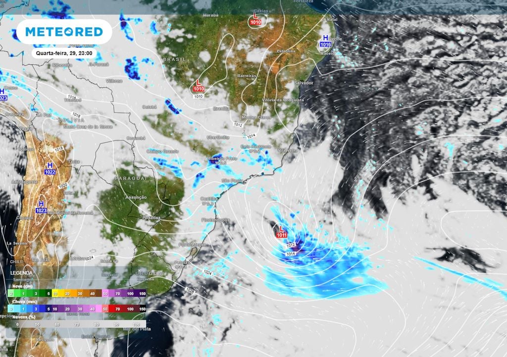 Previsão de ventos, pressão, nebulosidade e chuva no final da quarta-feira mostra um ciclone extratropical sobre o Oceano Atlântico, com centro na altura da região Sul | Imagem: Meteored